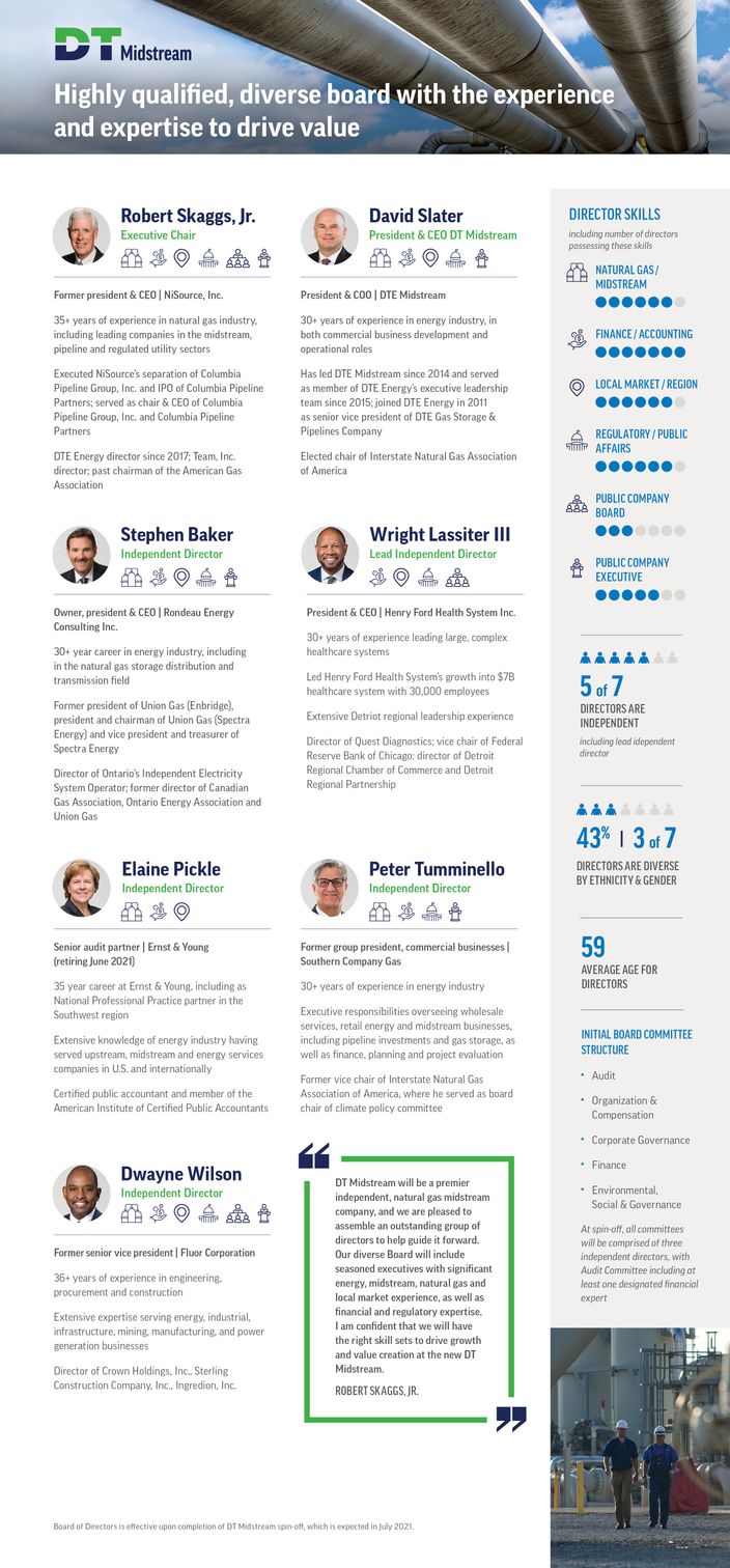 “DT Midstream will be a premier independent, natural gas midstream company, and we are pleased to assemble an outstanding group of directors to help guide it forward,” said Skaggs. “Our diverse Board will include seasoned executives with significant energy, midstream, natural gas and local market experience, as well as financial and regulatory expertise. I am confident that we will have the right skill sets to drive growth and value creation at the new DT Midstream."